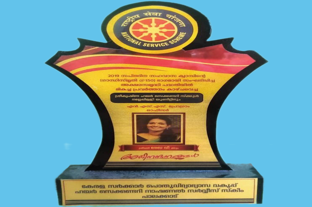 Congratulations to NSS Unit of Sreekrishna Higher Secondary School Nallepilly and Program officer Smt.Rekha.V for their outstanding performance in the Aksharasmridhi project organized as part of the 2019 Seven day Cohabitation Camp ( Gandhismridhi@150).